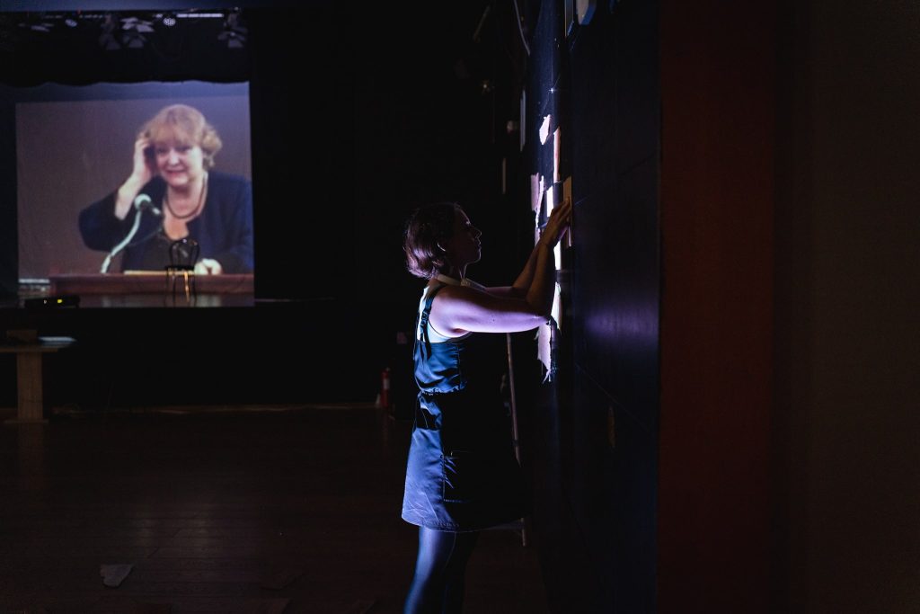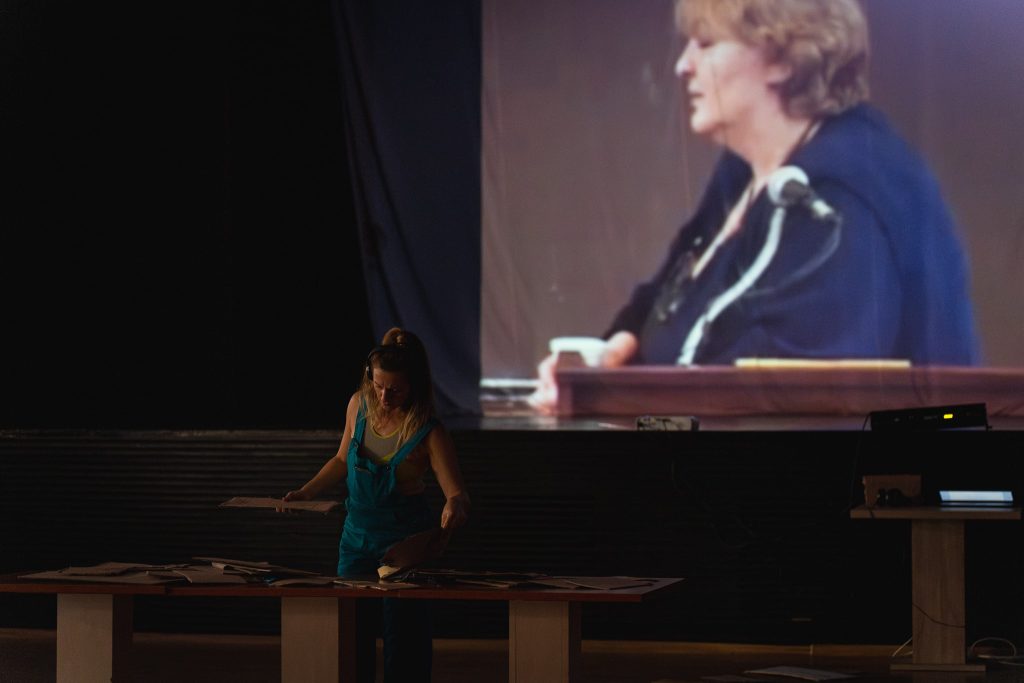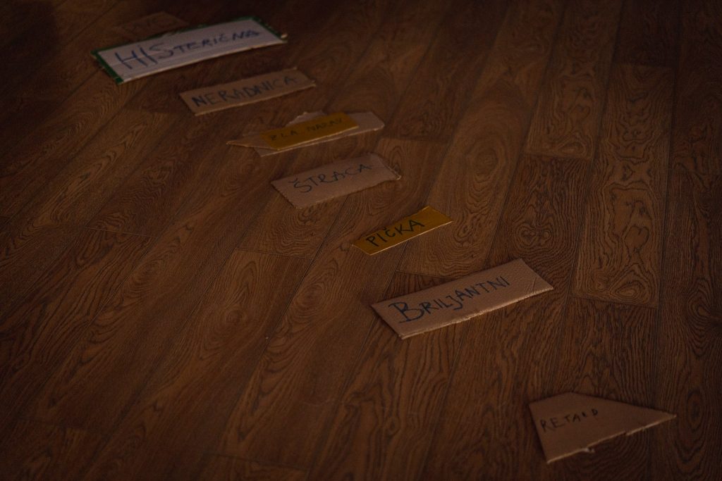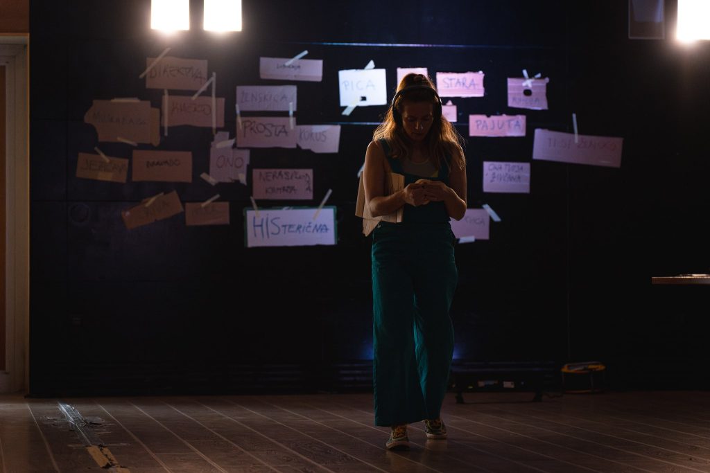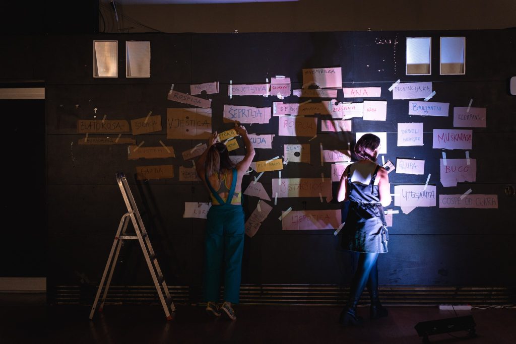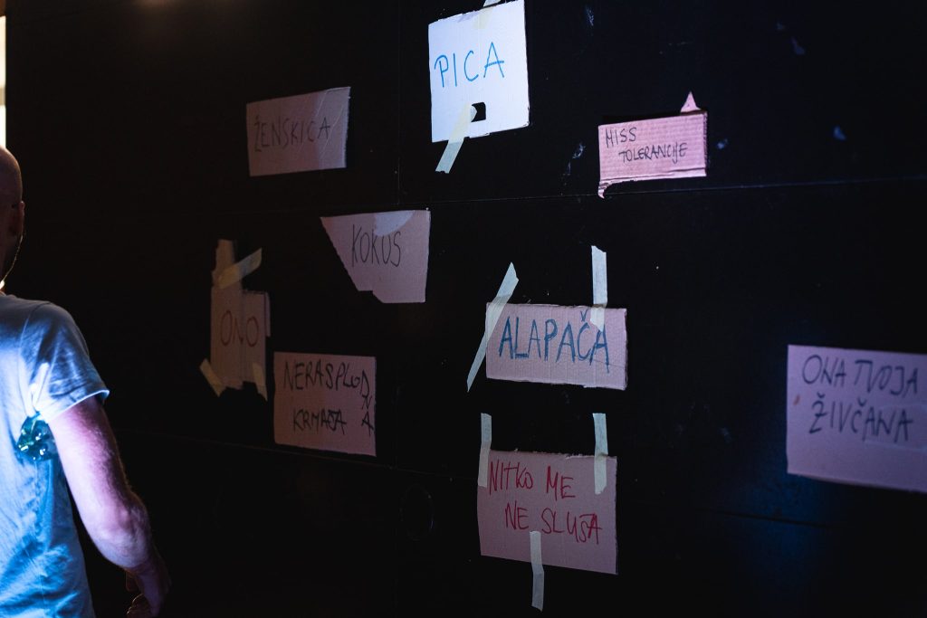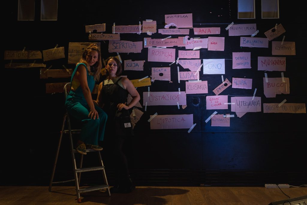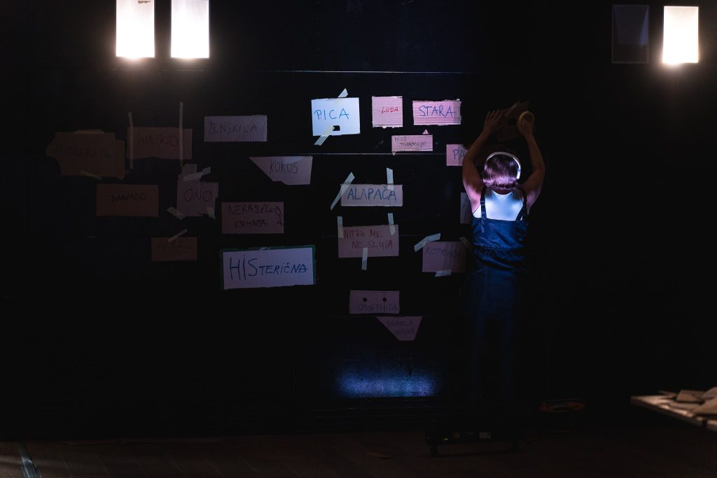 Postavljene su tri razine izvedbe; na pozornicu su smještene osobne ispovijedi žena, iza kojih se vrti projekcija Dubravke Ugrešić ( mute) s predavanja na Boston college. U centralnom djelu dvorane je “radionica” (craft shop) gdje se odvija radni dio; ispisivanje naziva za žene (sinonima, pogrdnih izraza, sjećanja, osobnih manifestacija, asocijacija…) koje se potom lijepe na zidove s lijeve i desne strane dvorane koji su osvijetljeni reflektorima. U trećem djelu je publika, prema kojoj također komuniciramo, postavljajući pločice s riječima ispred i uokolo njih, pozivajući ih da nam se pridruže i napišu na karton svoja iskustva.