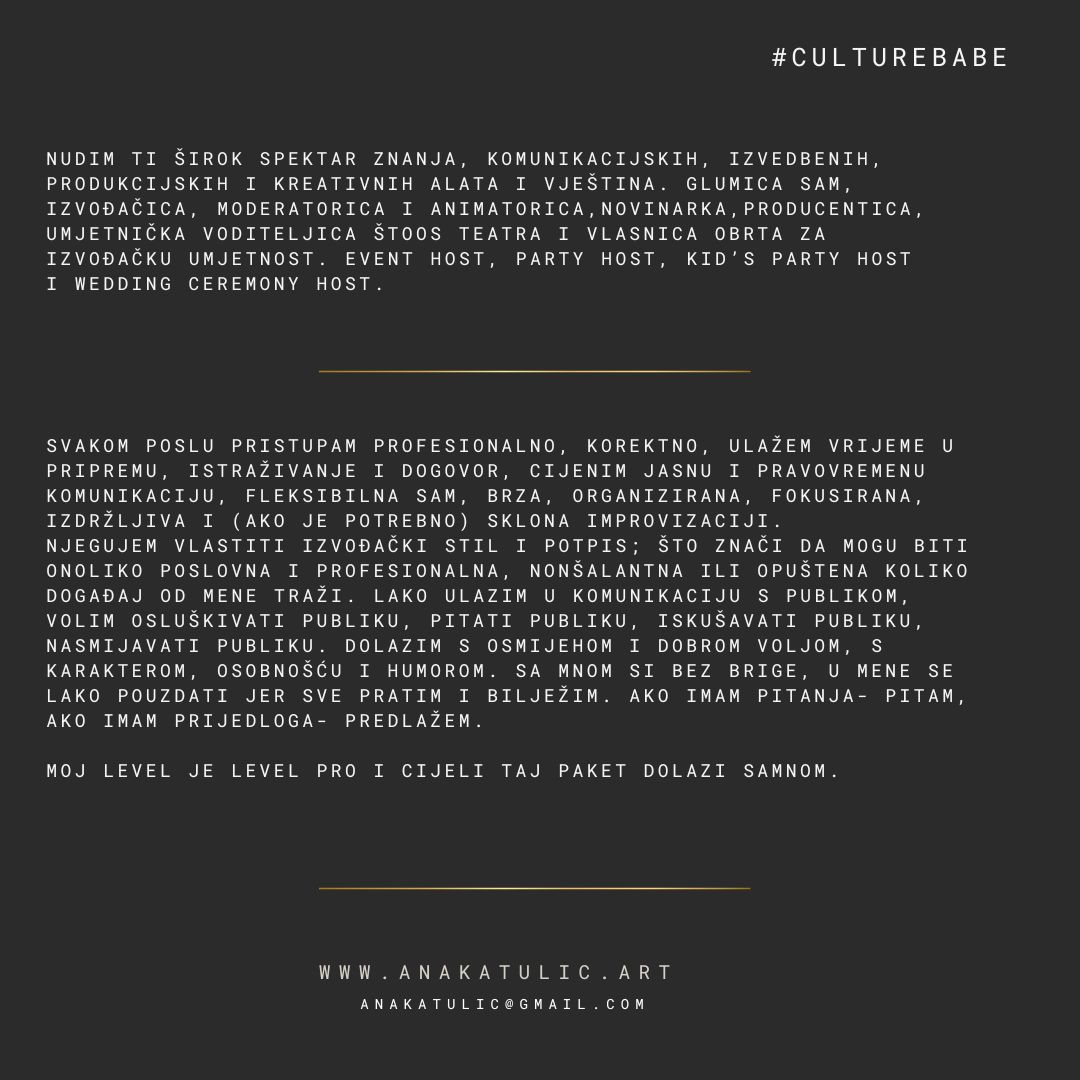 Svakom poslu pristupam profesionalno, korektno, ulažem vrijeme u pripremu, istraživanje i dogovor, cijenim jasnu i pravovremenu komunikaciju, fleksibilna sam, brza, organizirana, fokusirana, izdržljiva pod pritiskom, a ako je potrebno sklona i improvizaciji. Prilikom prezentacije njegujem svoj izvođački stil i potpis; što znači da mogu biti onoliko poslovna i profesionalna, nonšalantna ili opuštena koliko događaj od mene traži. Lako ulazim u komunikaciju s publikom, volim osluškivati publiku, pitati publiku, iskušavati publiku, nasmijavati publiku, dolazim s osmijehom i dobrom voljom, s karakterom, osobnošću i humorom. Sa mnom si bez brige, u mene se lako pouzdati jer sve pratim i bilježim. Ako imam pitanja- pitam, ako imam prijedloga- predlažem. Moj level je Level Pro i cijeli taj paket dolazi sa mnom.