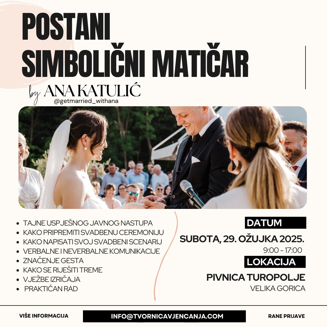 U suradnji s platformom Tvornica vjenčanja organizirat ćemo radionicu, neformalnu jednodnevnu edukaciju za simbolične matičare, u Velikoj Gorici (Pivnica Turopolje), u subotu, 29.3.2025 od 9 do 17 sati. Radionica je namijenjena svakome tko se želi okušati u poslu simboličnog matičara ili voditelja svadbene ceremonije, bez obzira na razinu iskustva u bilo kojoj formi javnog nastupa. Kroz šest modula provest ću vas kroz teoriju i praksu matičarskog posla, te dati korisne informacije, trikove, savjete iz prakse, vježbe kako pripremiti govor, skript ceremonije, kako formirati cijenu, kako komunicirati s mladencima, a tu su i vježbe za govor, izgovor i dikciju, kao i još neke pogodnosti i beneficije ali psst🤫…o tome naknadno, na samoj radionici.